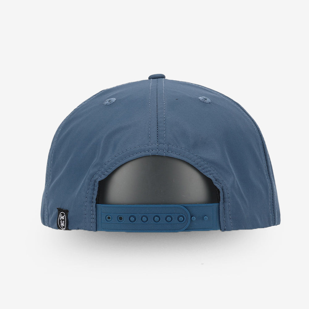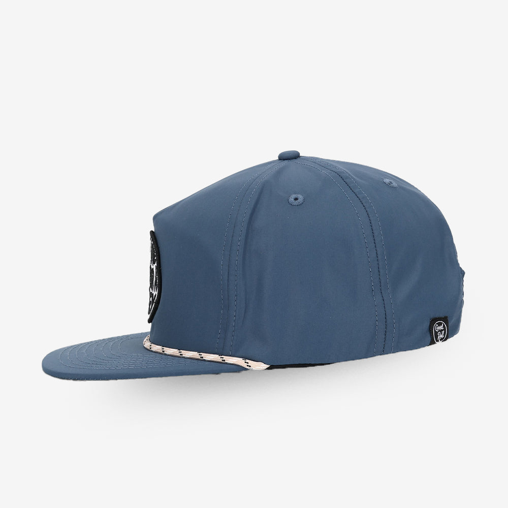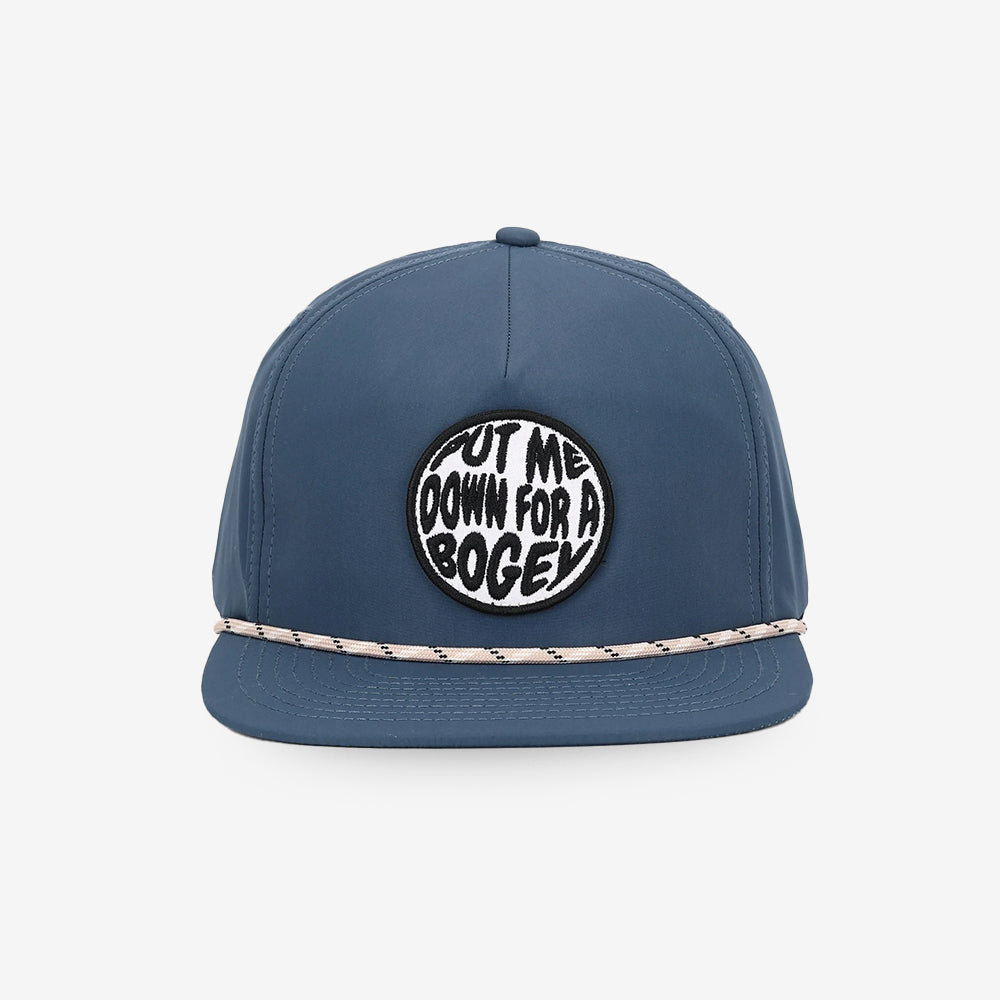 The Bogeys Only hat is an unstructured ball cap and has a blue base, colored rope and circular embroidered crown logo. The average golfers go to ball cap.